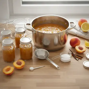 Sterilizácia: poháre s broskyňovým džemom/lekvárom vložte do vodného kúpeľa s teplotou 85–90 °C na 10–15 minút (podľa veľkosti; voda po závit). Alternatíva: rúra 100 °C / 15 minút na plechu s vodou. Pri nízkom alebo nulovom cukre sterilizujte skôr 15–20 minút.
