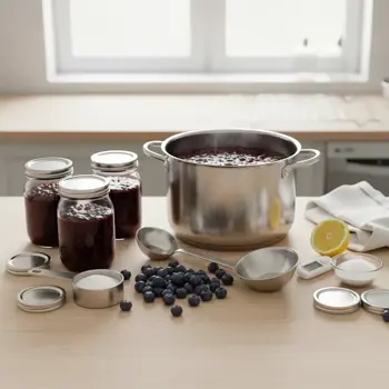 Sterilizácia: poháre s čučoriedkovým džemom/lekvárom vložte do vodného kúpeľa s teplotou 85–90 °C na 10–15 minút (podľa veľkosti; voda po závit). Alternatíva: rúra 100 °C / 15 minút na plechu s vodou. Pri nízkom alebo nulovom cukre sterilizujte skôr 15–20 minút.