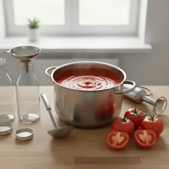 Kečup je kyslá konzerva – drž správny podiel octu (alebo citrónovej šťavy) a soľ, plň horúci do horúcich fliaš a pasterizuj 80–85 °C v odporúčaných časoch. Olej do pohárov nepridávaj (znižuje bezpečnosť). Pri jemných „kids“ verziách nenechaj pH „na hrane“ – drž aspoň spodnú dávku octu a radšej dlhšiu redukciu.