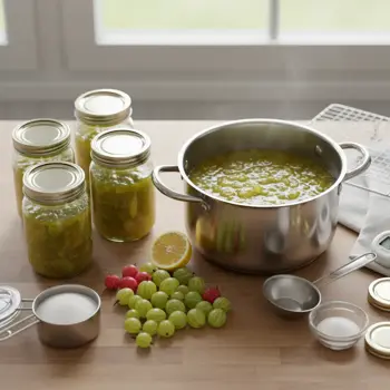 Sterilizácia: poháre s egrešovým džemom vložte do vodného kúpeľa s teplotou 85–90 °C na 10–15 minút (voda po závit). Alternatíva: rúra 100 °C / 15 minút na plechu s vodou. Pri nízkom cukre voľte skôr 15–20 minút.