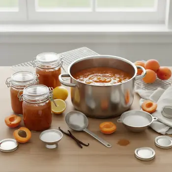 Sterilizácia: poháre s marhuľovým džemom/lekvárom vložte do vodného kúpeľa s teplotou 85–90 °C na 10–15 minút (podľa veľkosti; voda po závit). Alternatíva: rúra 100 °C / 15 minút na plechu s vodou. Pri nízkom alebo nulovom cukre sterilizujte skôr 15–20 minút.
