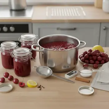 - Príprava: višne premiešajte s cukrom (napr. 350–600 g/kg podľa kyslosti), citrónom a voliteľnými koreninami.